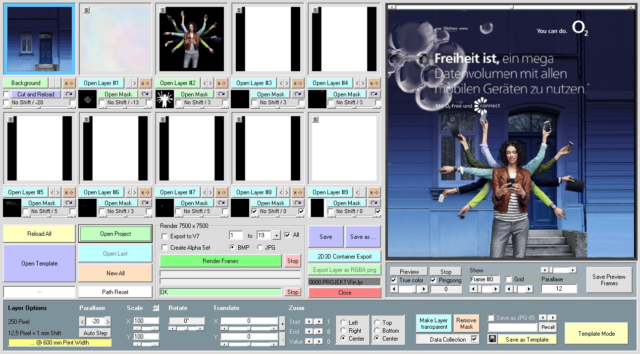 Im Ebenen Modul können 3D Bilder auf bis zu 10 Ebenen komponiert werden. Jede Ebene bestehen aus einem Bild-Inhalt und einer Freistell-Maske, mit der der jeweilige Bild-Inhalt auf die jeweils darunter liegende Ebene abgebildet wird. Auf alle Ebenen können sowohl Einzelbilder als auch Sequenz von Bildern und Freistell-Masken geladen werden. Die aus dem Ebenensatz entstehende 3D-Bild-Sequenz wird im Hauptmodul des Interlacers zur Druckdatei (dem Interlacing) verrechnet. Jede Ebene kann im Raum frei nach vorne oder hinten verschoben, skaliert, rotiert und nach oben und unten versetzt werden. Eine Echtzeit-Vorschau in 3D Animation oder als Anaglyphenbild unterstützt Sie bei der Komposition.