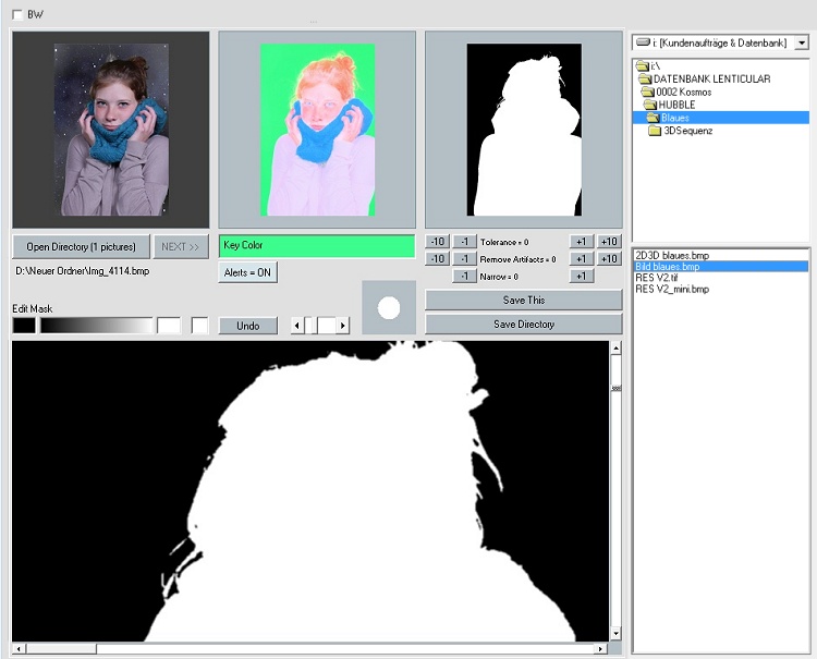 Dieses Programm erzeugt Freistell-Masken aus z.B. 3D Portrait Foto-Serien, die vor einfarbigem Hintergrund aufgenommen wurden. Schlüsselfarbe, Toleranz und Randübergänge sind einstellbar. Kleine Fehler können manuell ausgebessert werden.