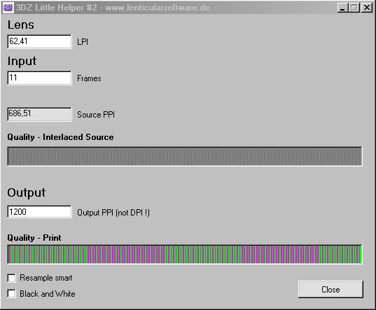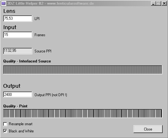 Basis des Programms ist ein Schwarz/Weiß Interlacing, das entsprechend der von Ihnen gemachten Eingaben skaliert und abgebildet wird. Je nach Skalierungsverhältnis entstehen mehr oder weniger störende Artefakte in der Strunktur des Interlacings. Dies zu wissen und zu berücksichtigen, kann zur Verbesserung Ihrer gedruckten Ergebnisse beitragen.
