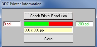 Dieses Modul schickt einen simulierten Job an den Drucker / Druckertreiber und erfragt seine Werte. Die erzielbar Auflösung wird in einem rot-grünen Balken dargestellt. Der Messbereich geht bis 1200 ppi. Optimal ist es, wenn der ganze Balken grün ist. Der Drucker druckt dann 1200 Pixel per Inch. Geringere Werte führen zu schlechteren Resultaten.