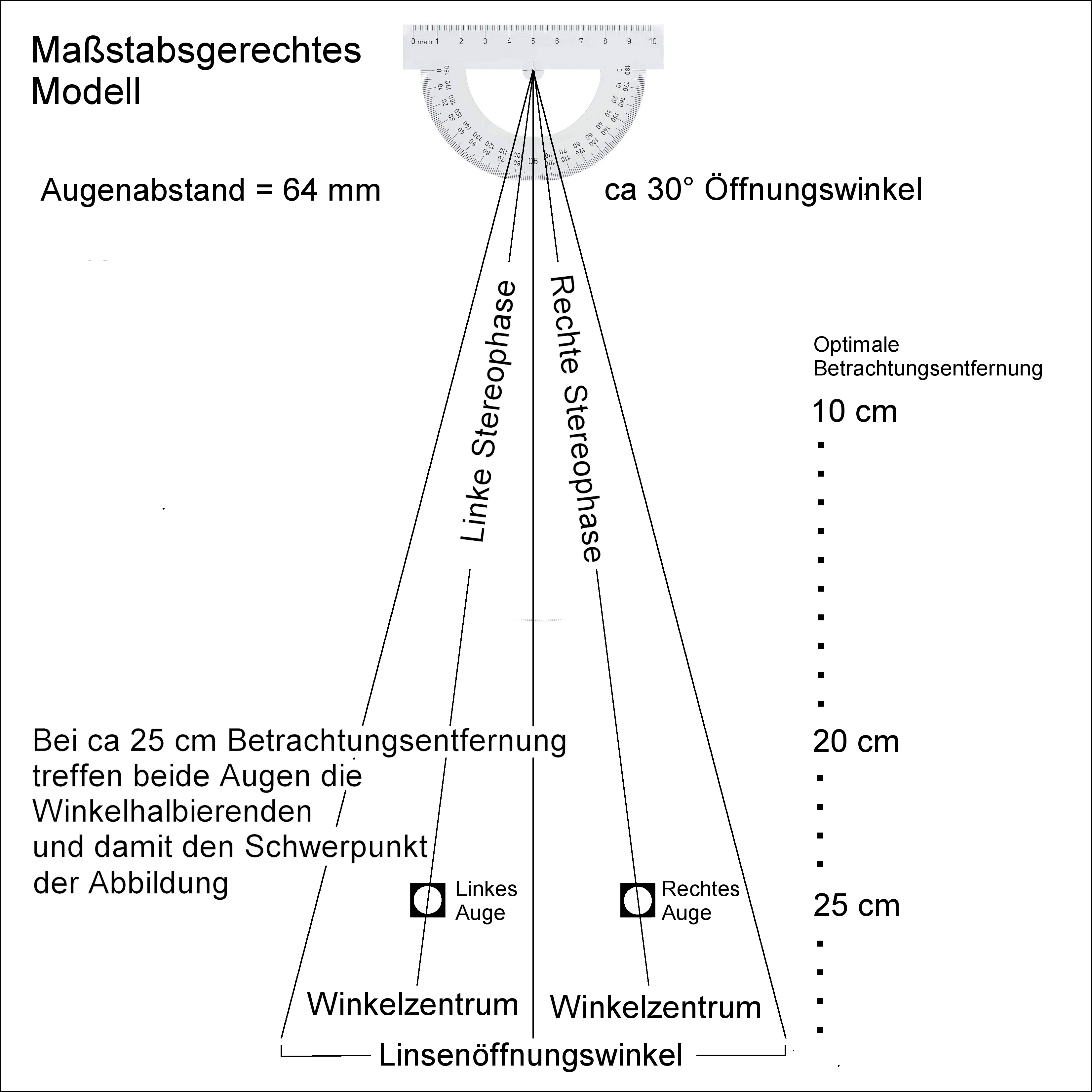 Um eine optimale 3D-Wahrnehmung zu erreichen, muss die Betrachtungsdistanz an den Augenabstand angepasst werden! Personen mit eng stehenden Augen müssen das Bild aus geringerer und solche mit weit stehenden Augen aus fernerer Distanz betrachten. Bei einem durchschnittlichen Augenabstand von 64 mm und einem Linsenöffnungswinkel von ca 30 Grad ist eine Betrachtungsdistanz von ca 25 cm optimal. Aus allen anderen Entfernungen ist die 3D Ansicht begrenzt.